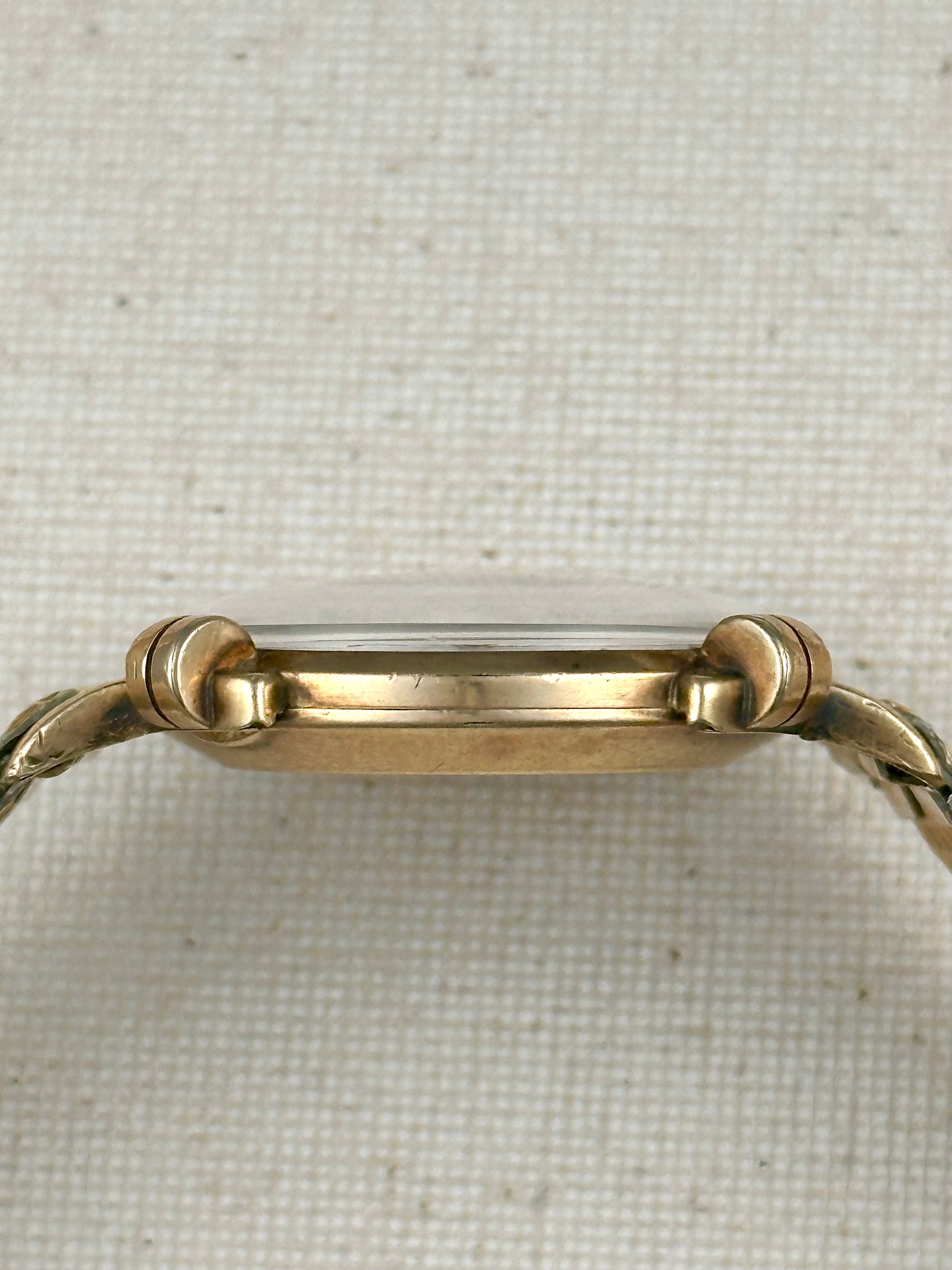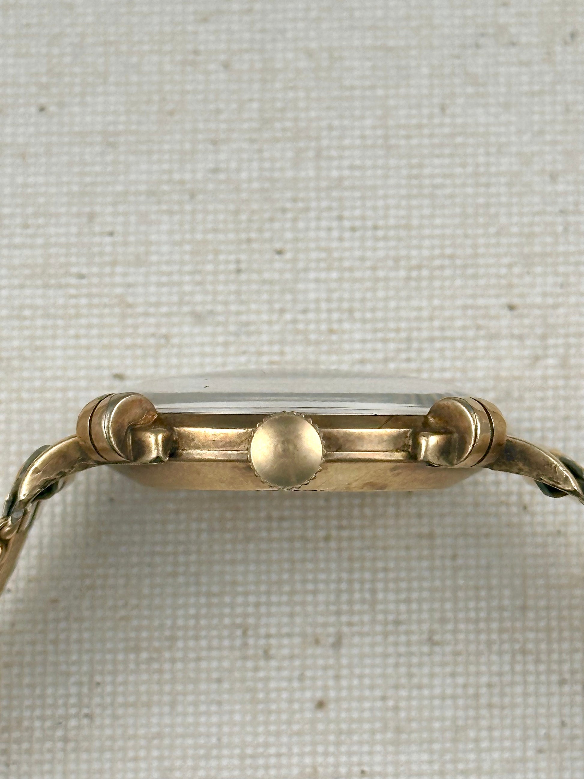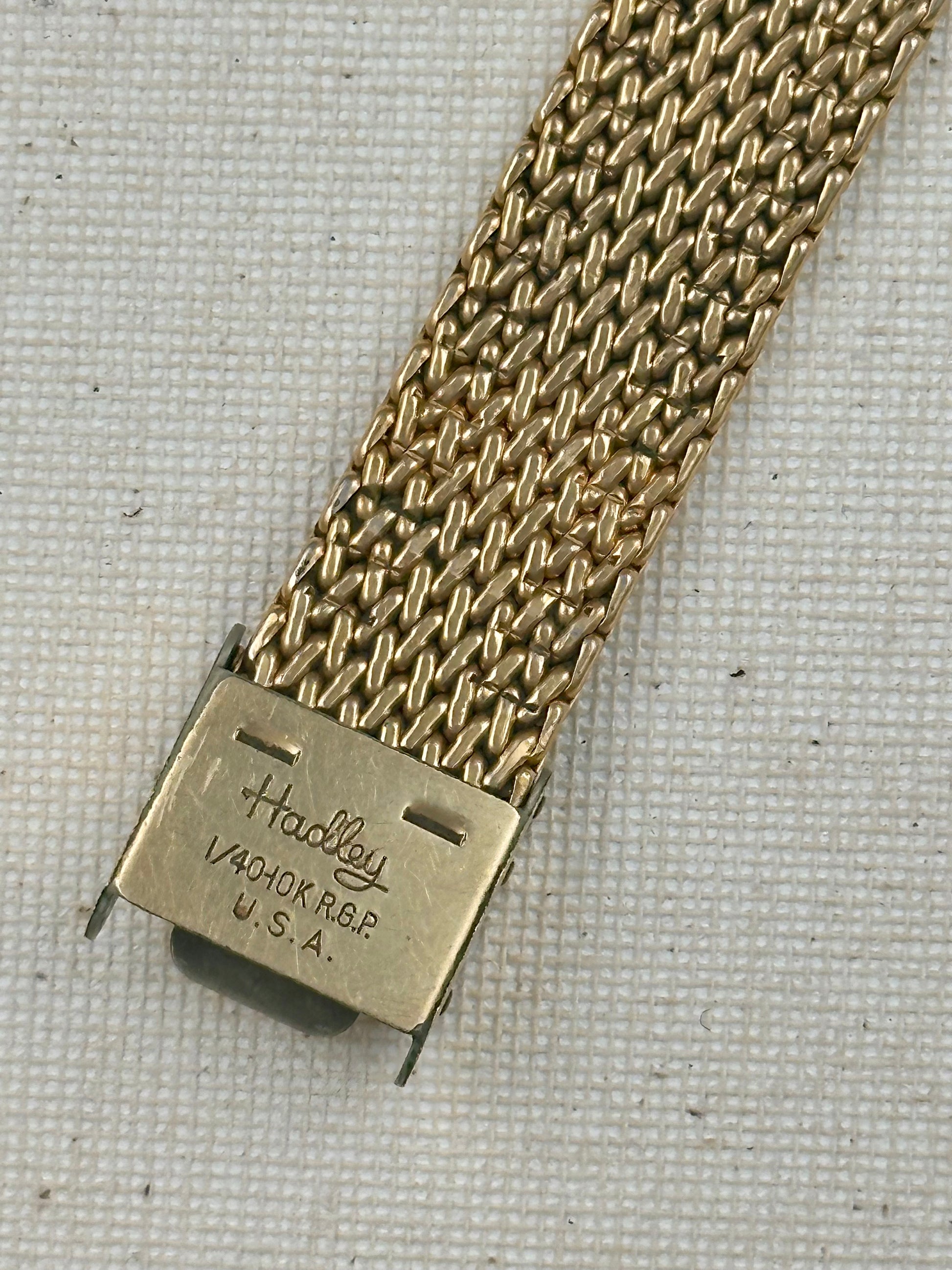 bracelet is a period correct Hadley rolled gold plated. Its in very good condition, not wear through at all and no rough spots. Fits wrists from 5.5 to 7.25 inches.