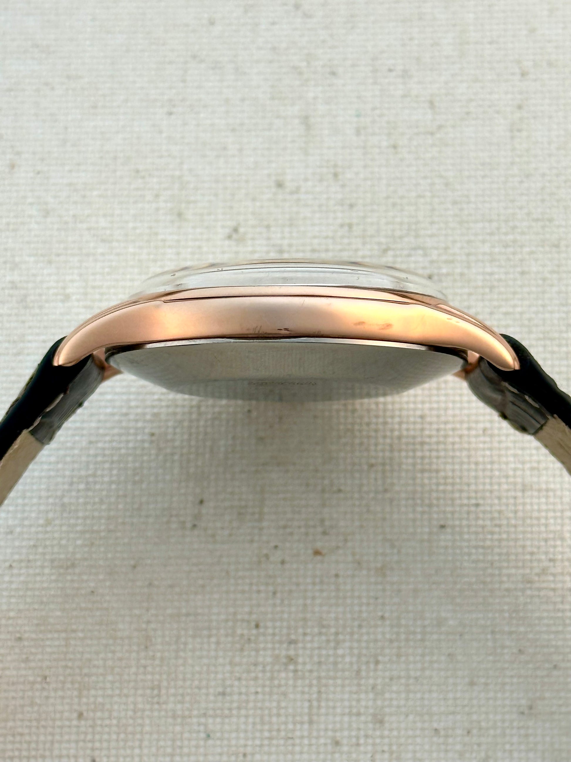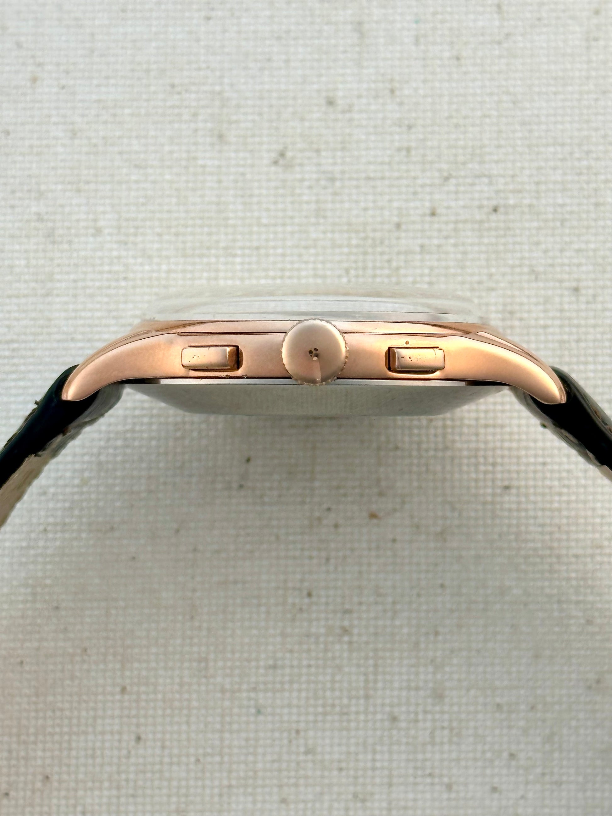 Dial is a cool copper color set off by pink gold colored stick hands and slightly darker patina'd registers.