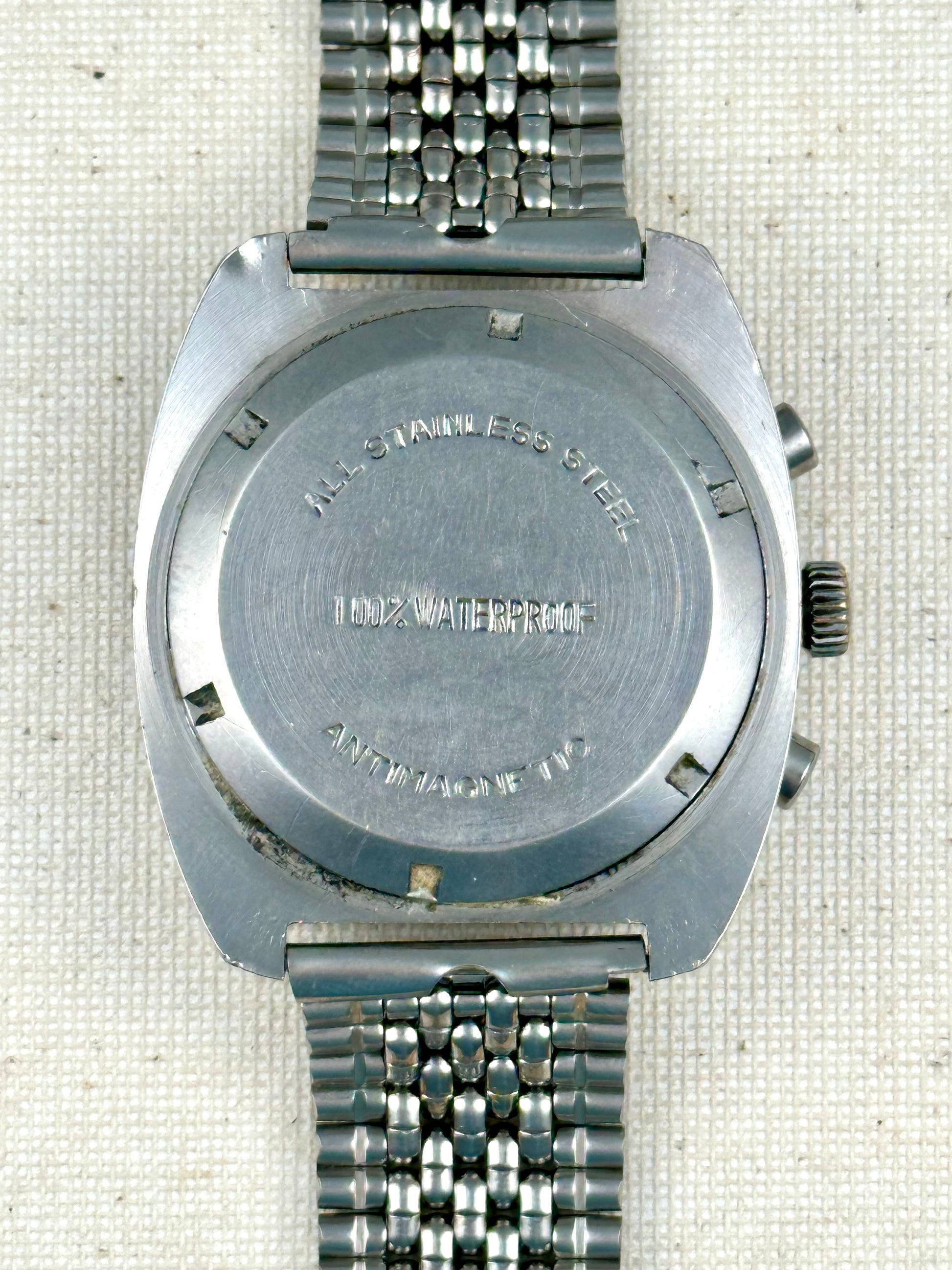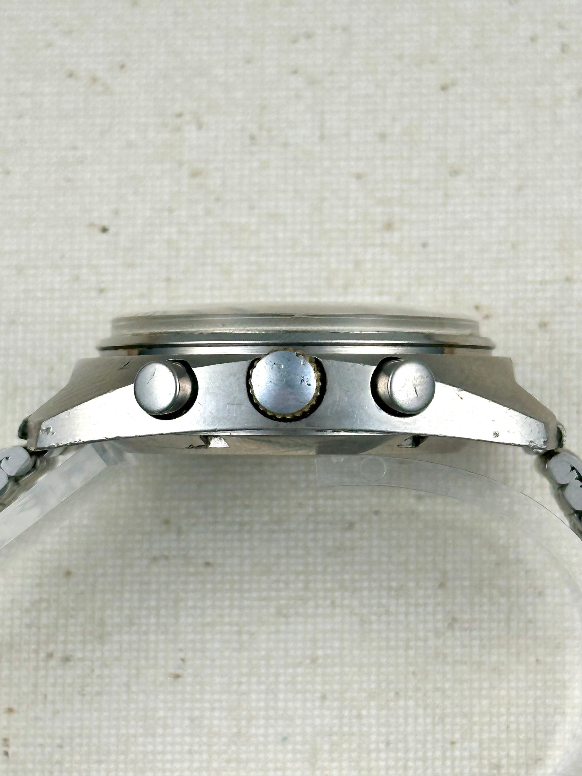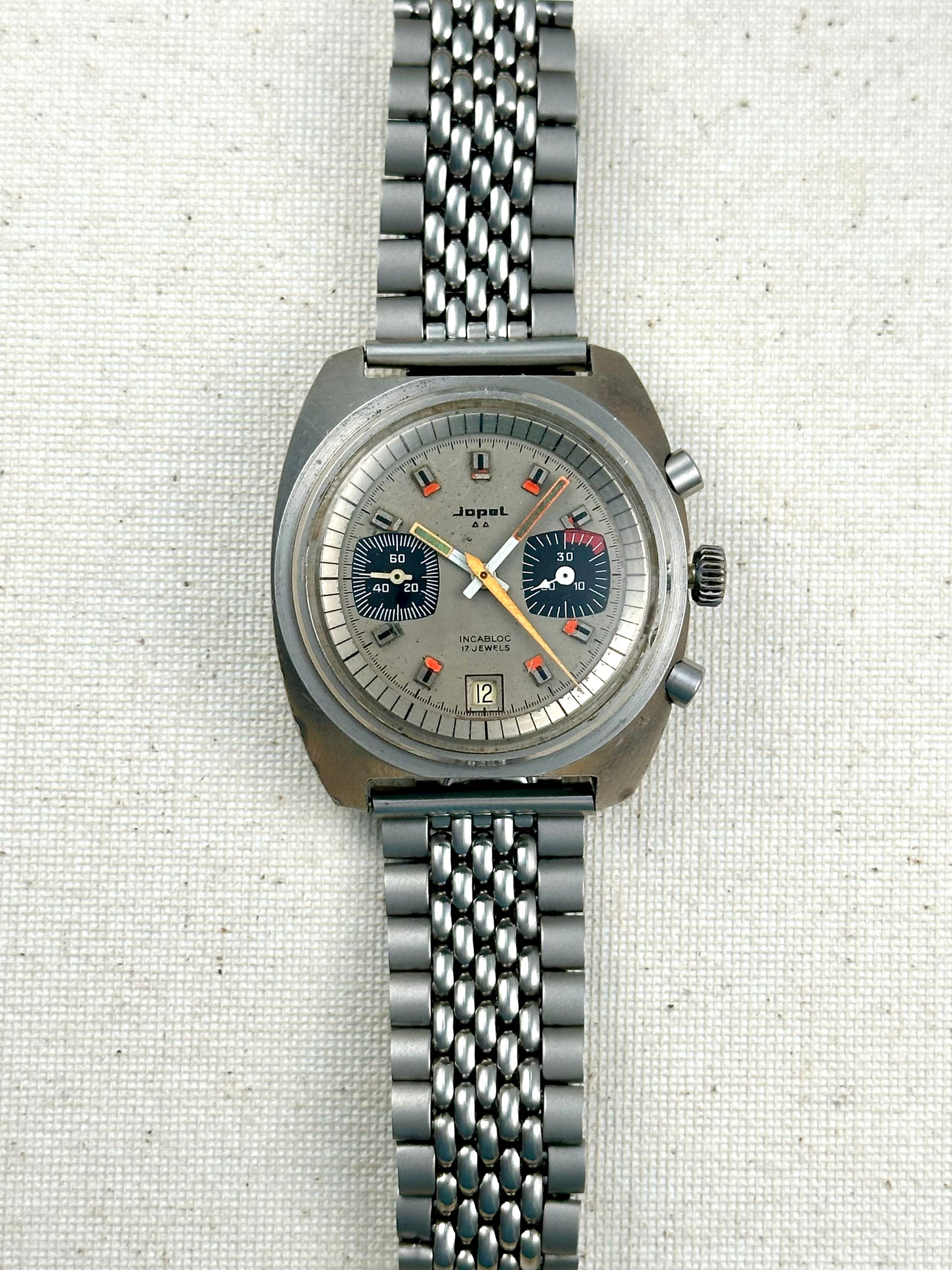 Really cool 1970s racing chrono on a spectacular beads of rice bracelet. This dial has all the colors!