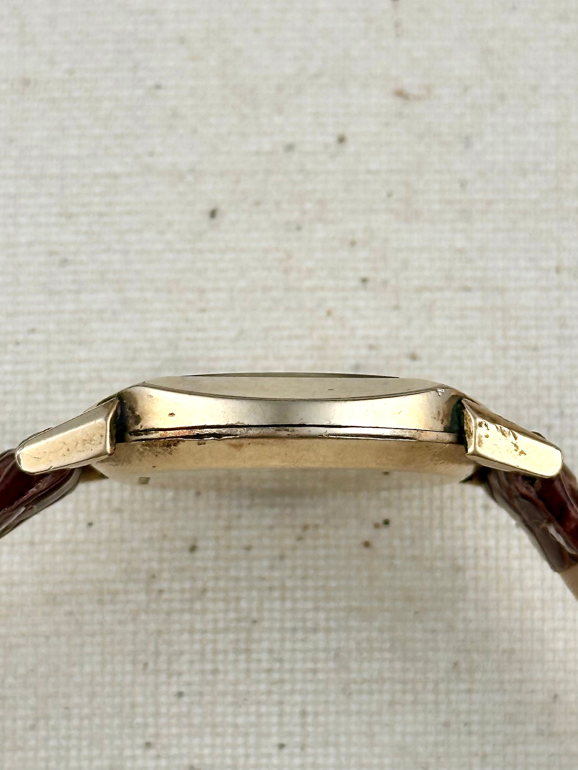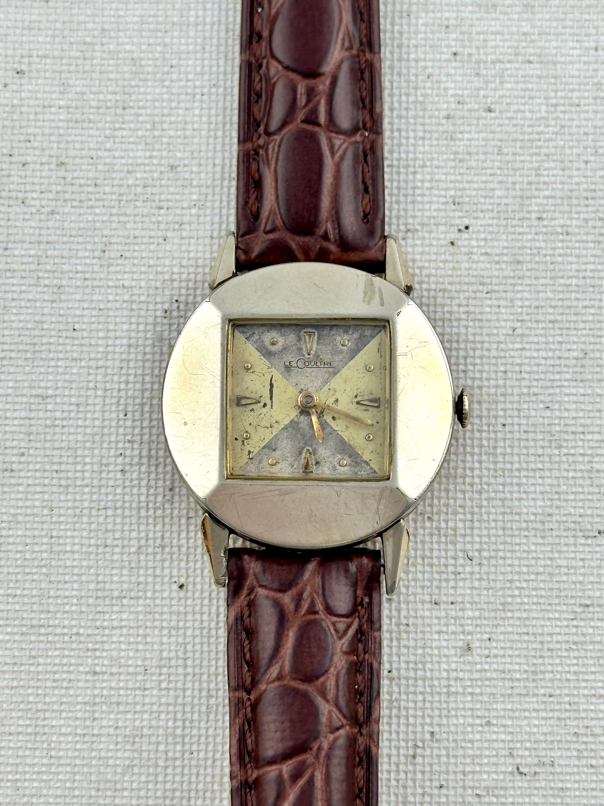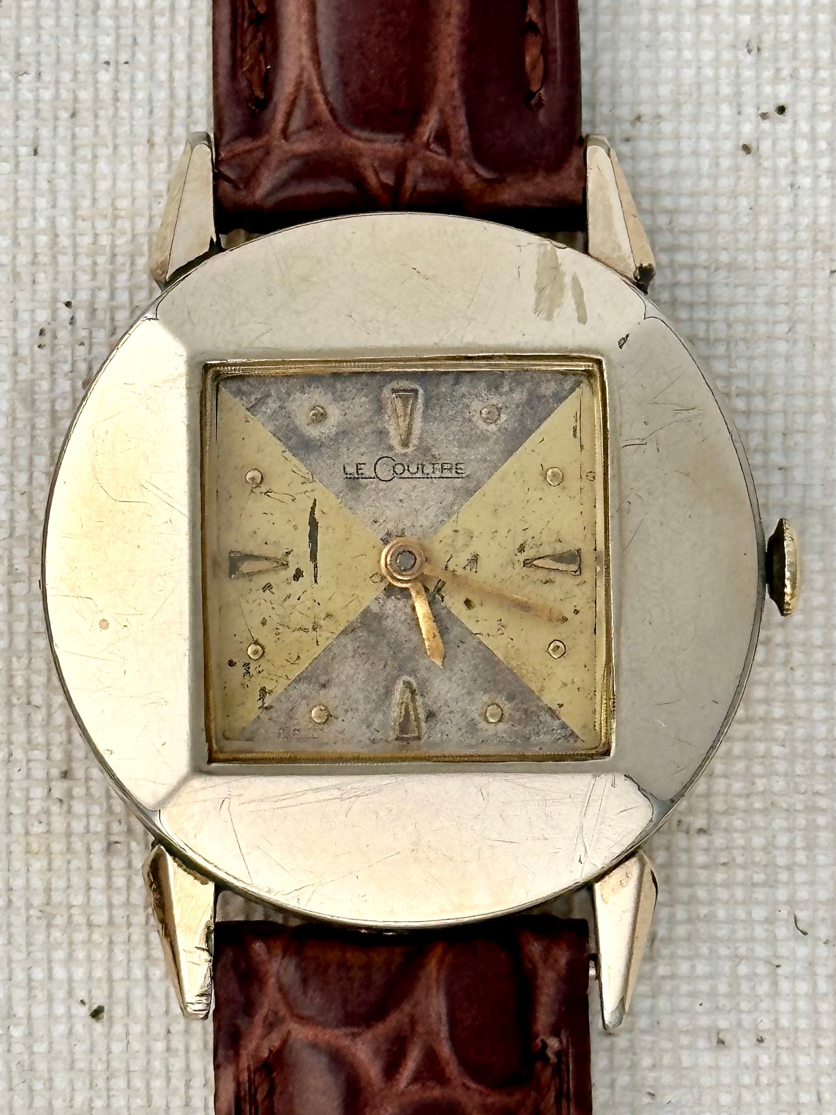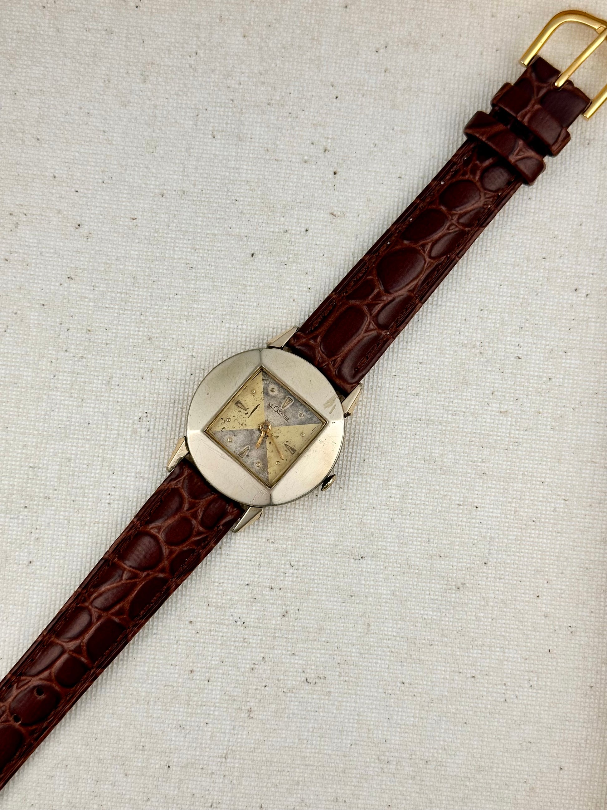 There is alot going on with this watch - circular case with angled bezel, square face, and right into triangle bowtie dial! Very eye-catching watch.