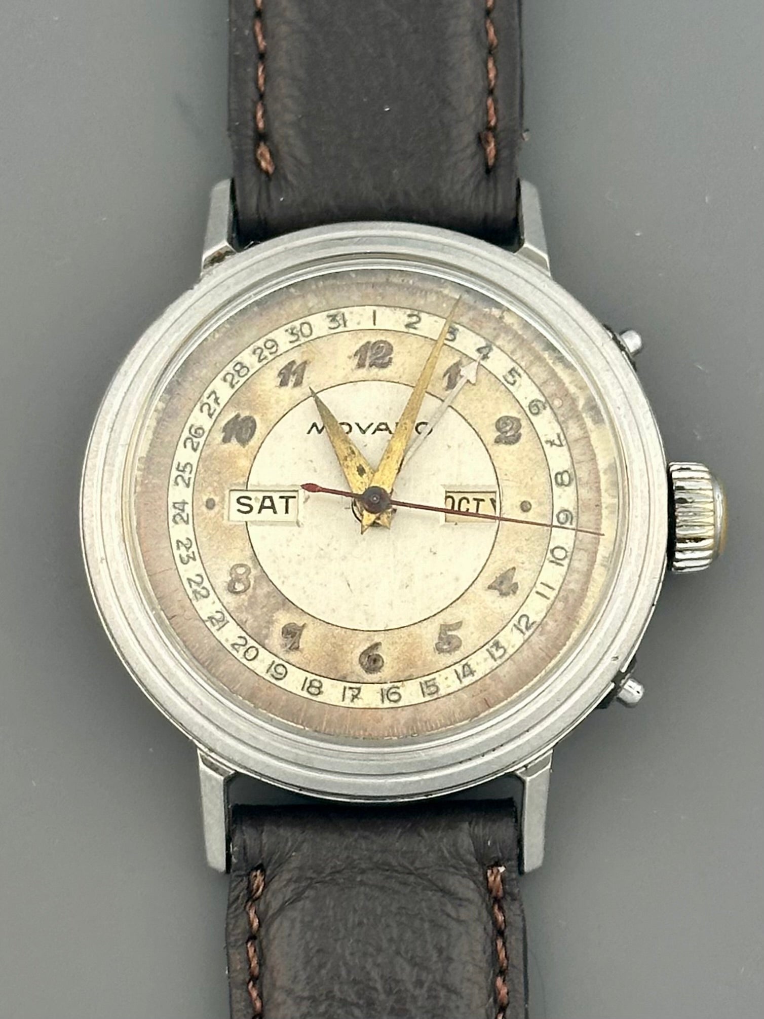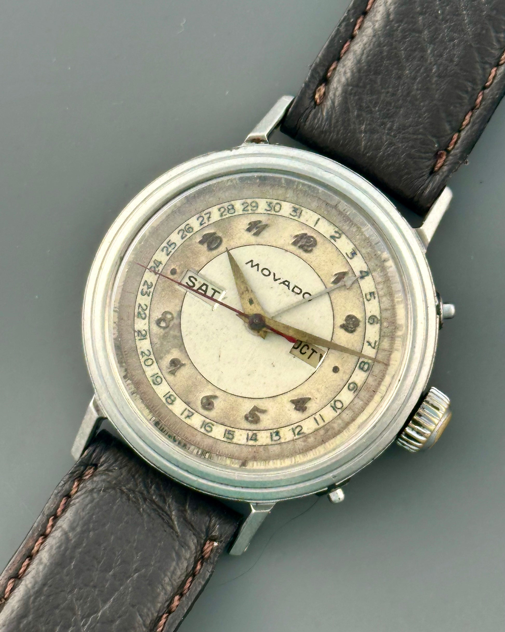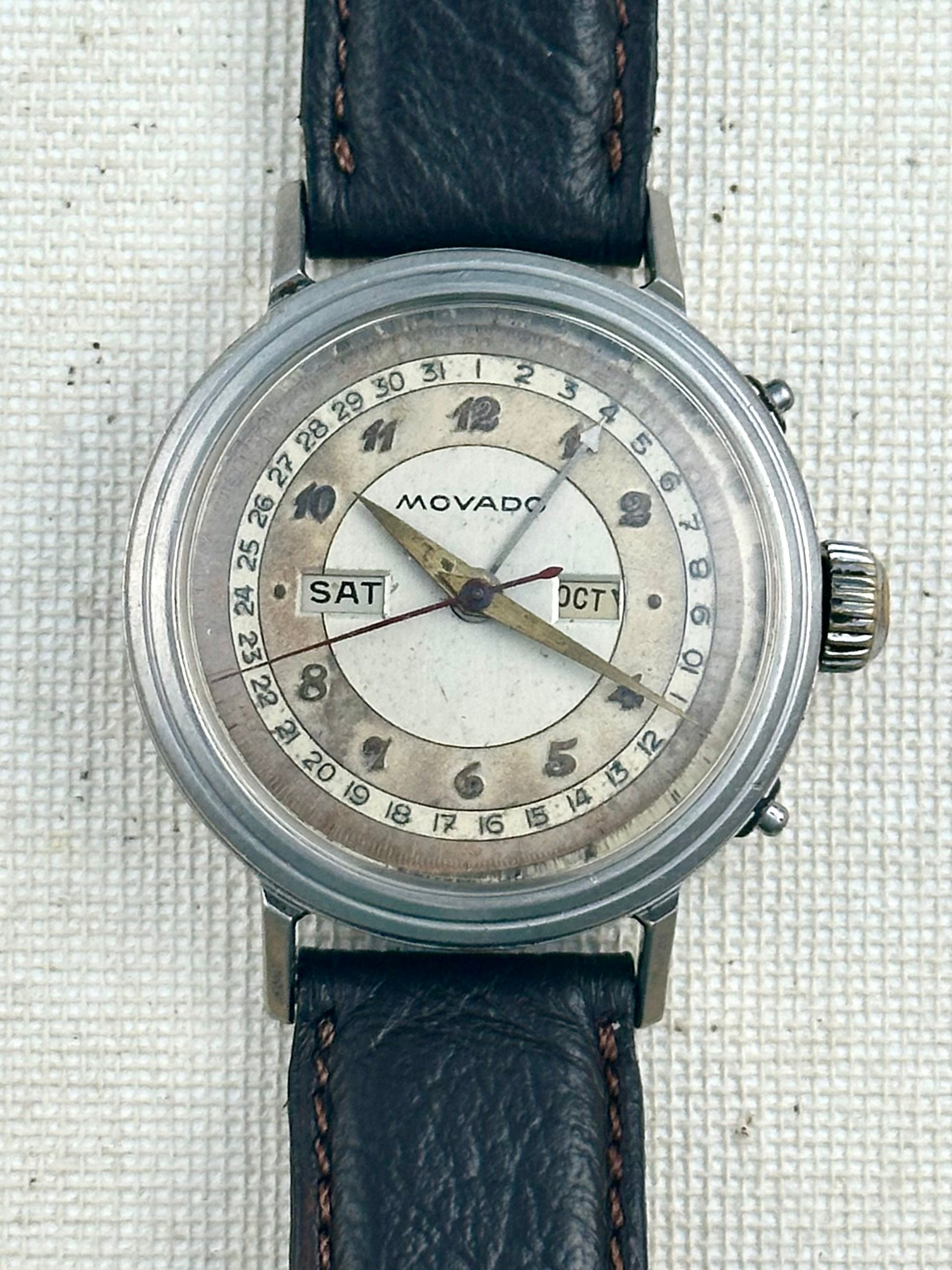 Really fun Movado Calendograf with the "borgel case" from right around 1950! Day, date, month calendar functions all in perfect working order (not always the case with the calendar movements).