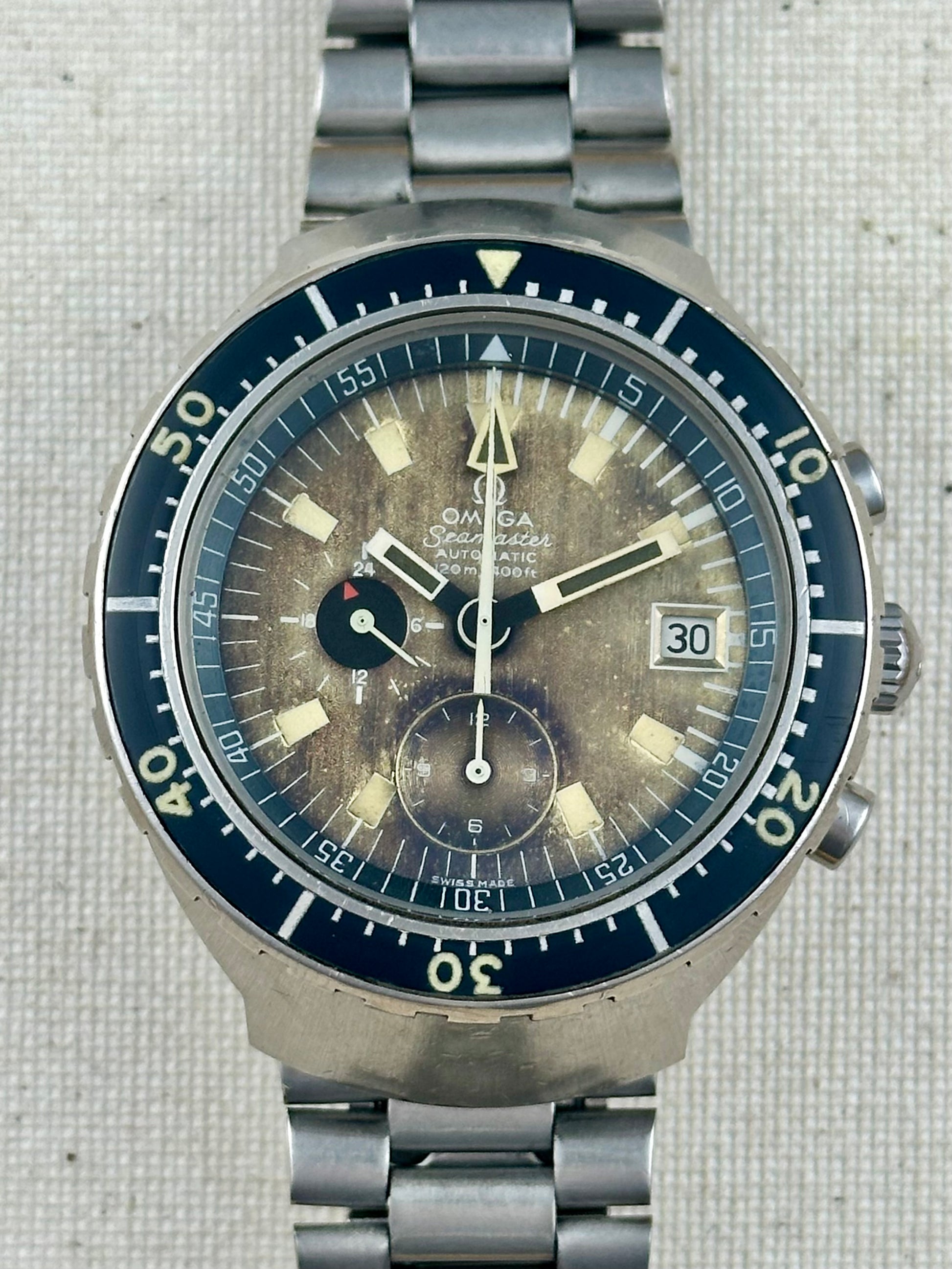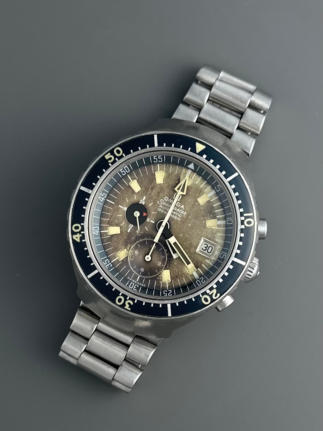 This watch is killer! Highly sought after and rarely available Omega Big Blue Seamaster Diver 300M with ref 176.004, and while the case and the bracelet and the hands are great - the bakelite bezel insert is amazing and the Grand Finale is this wild tropical dial. Dial is all sorts of crazy colors, no chipping no flaking - just amazing colors (brown, gold, white, copper)!